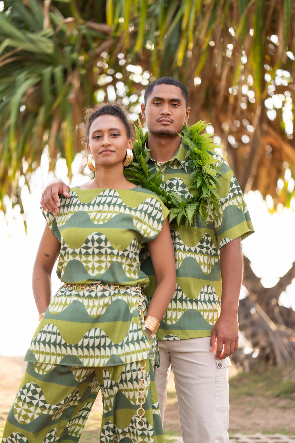 This style is named after Puʻu Kahuauli, a majestic peak that overlooks Kāneʻohe. Kahua means base or site and uli means dark and in this case, lush. Be as striking as Puʻu Kahuauli as you don this stately piece!