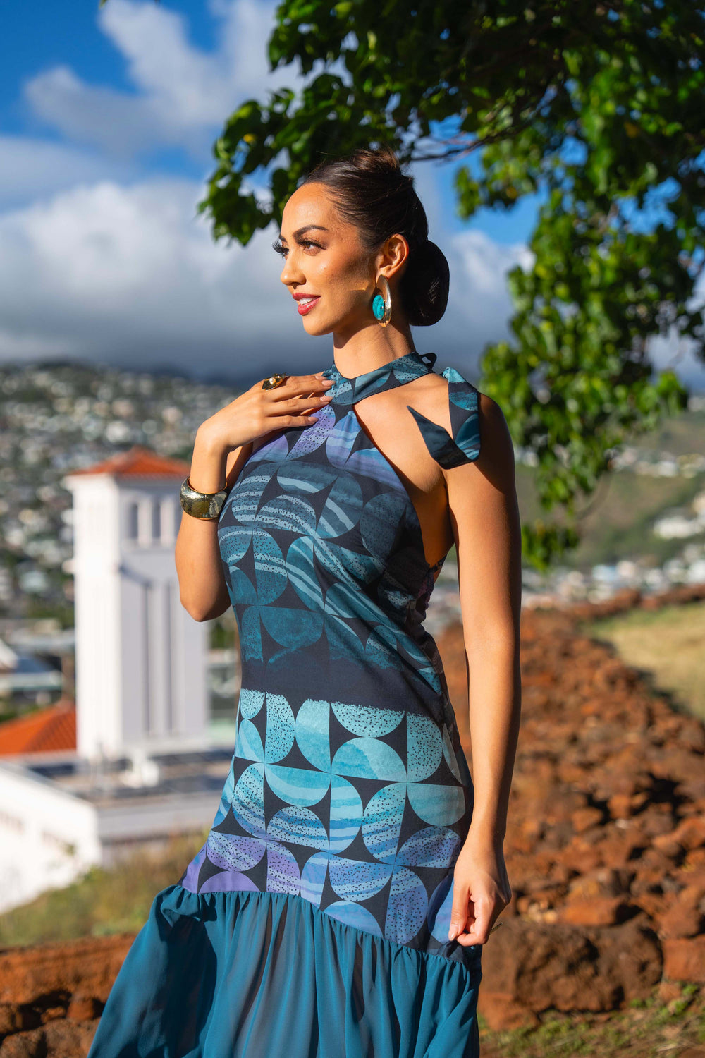 Our new ʻŌlani Dress is effortlessly elegant. This halter-style babe is designed with adjustable back straps for a custom fit, a side zipper for ease, and a flowing asymmetrical chiffon skirt that adds movement and allure to every step.