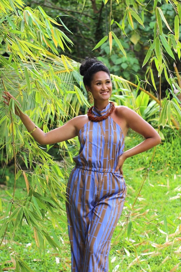 This timeless halter culotte jumpsuit was designed to elongate the body, hence the name Iwiloa, literally translating to "tall bone" and figuratively meaning "a tall person" (Pukui, "Hawaiian Dictionary").